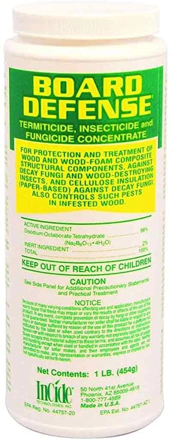 Board Defense is a slow acting stomach poison to insects and an instant contact poison to wood rot and fungi. As wood destroying insects and their larvae carry on their normal activities, they accumulate Board Defense into their systems. General insects such as ants, cockroaches, crickets and others will ingest the borate through their feeding and preening habits. An accumulation of Board Defense acts to poison the insect.